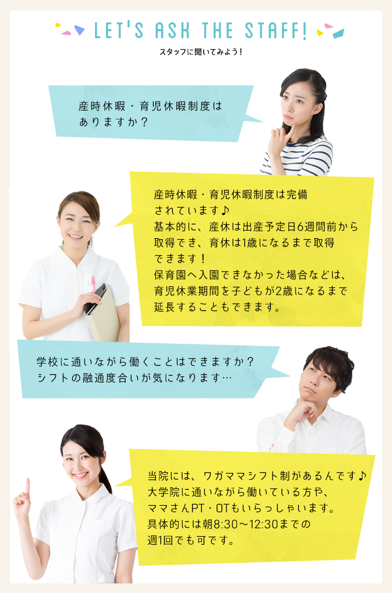 | 勤務時間 | 【正社員】 平日 8:30-18:30 土曜日 8:30-17:30 日曜日・祝日 8:30-12:30 【非常勤】 ※勤務時間はご相談に乗ります。 |